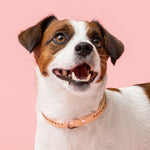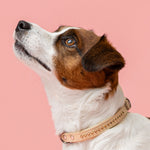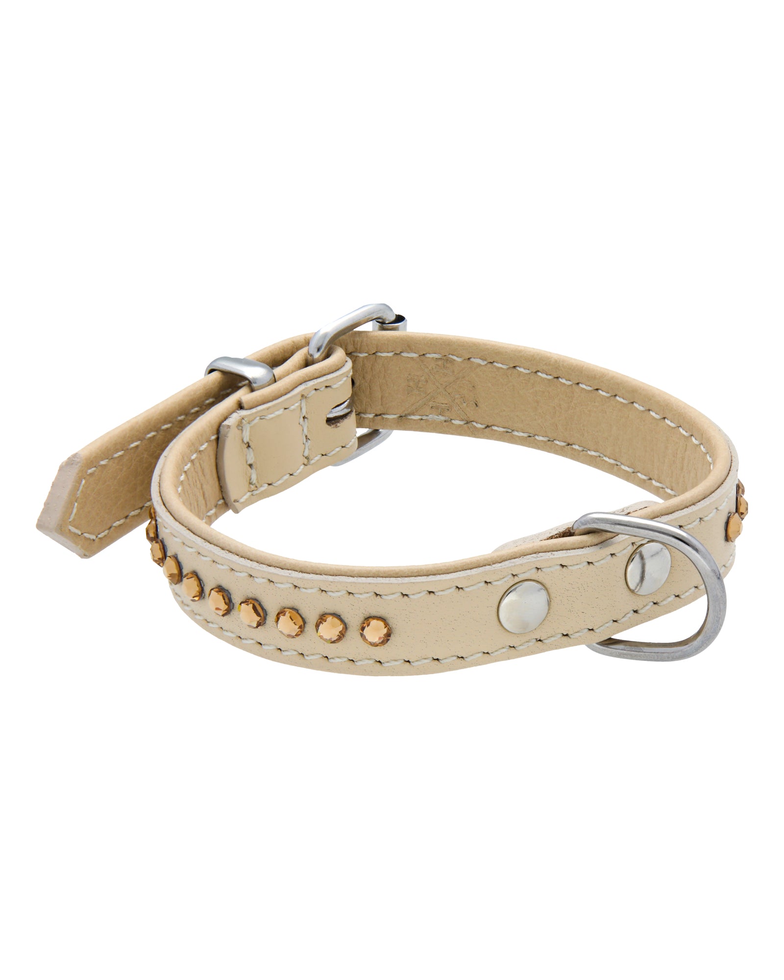 This collar has beautiful Swarovski stones in the Topaz shade. Topaz has golden sparkle in it but and it reflects all the lights beautifully. It makes a perfect fit with the beige leather base. The collar has also a D-ring to connect to your leash.