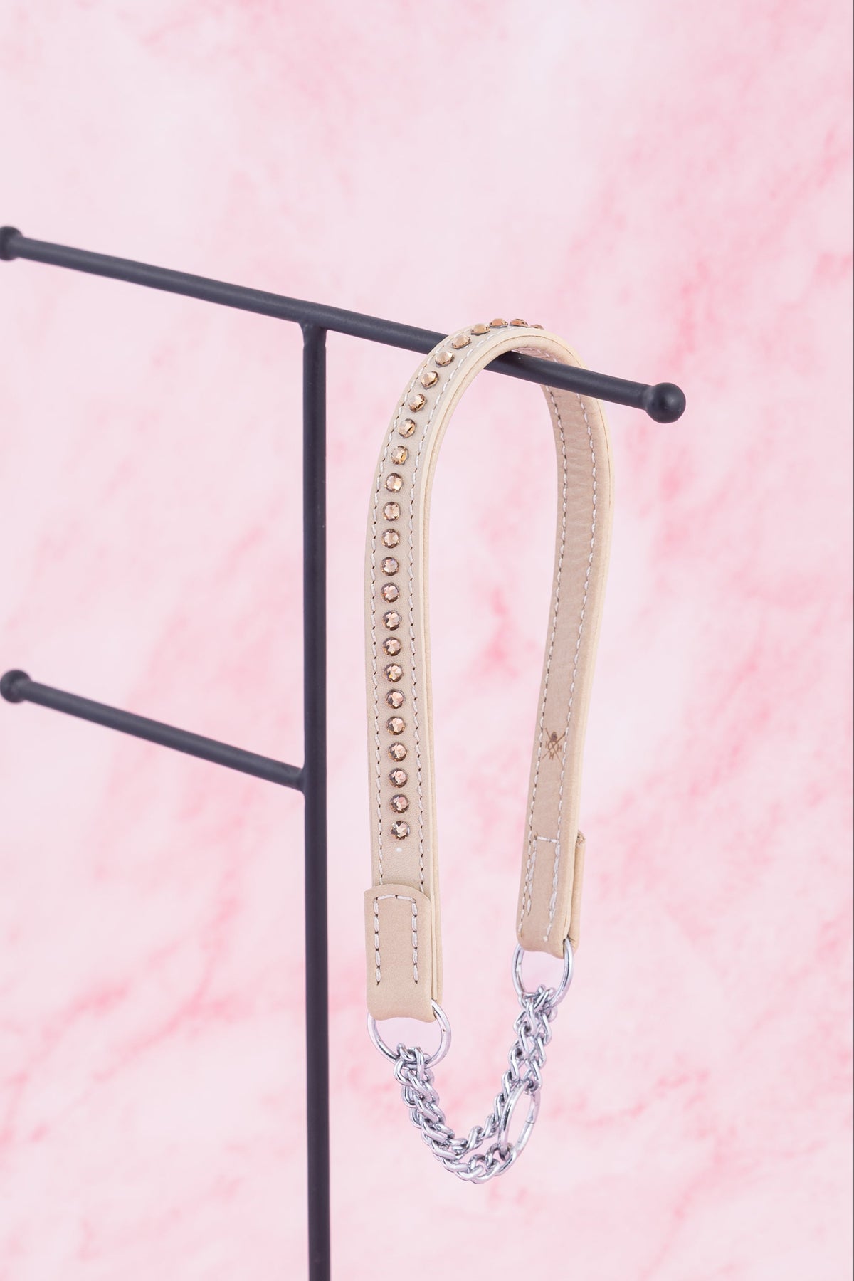 Topaasissa on kultainen kimallus, mutta sen lisäksi se heijastelee eri sävyjä kauniisti. Väri sopii täydellisesti beigeen nahka pohjaan. Kaulapannassa on hopeinen ketju, jonka päässä rengas talutushihnalle.